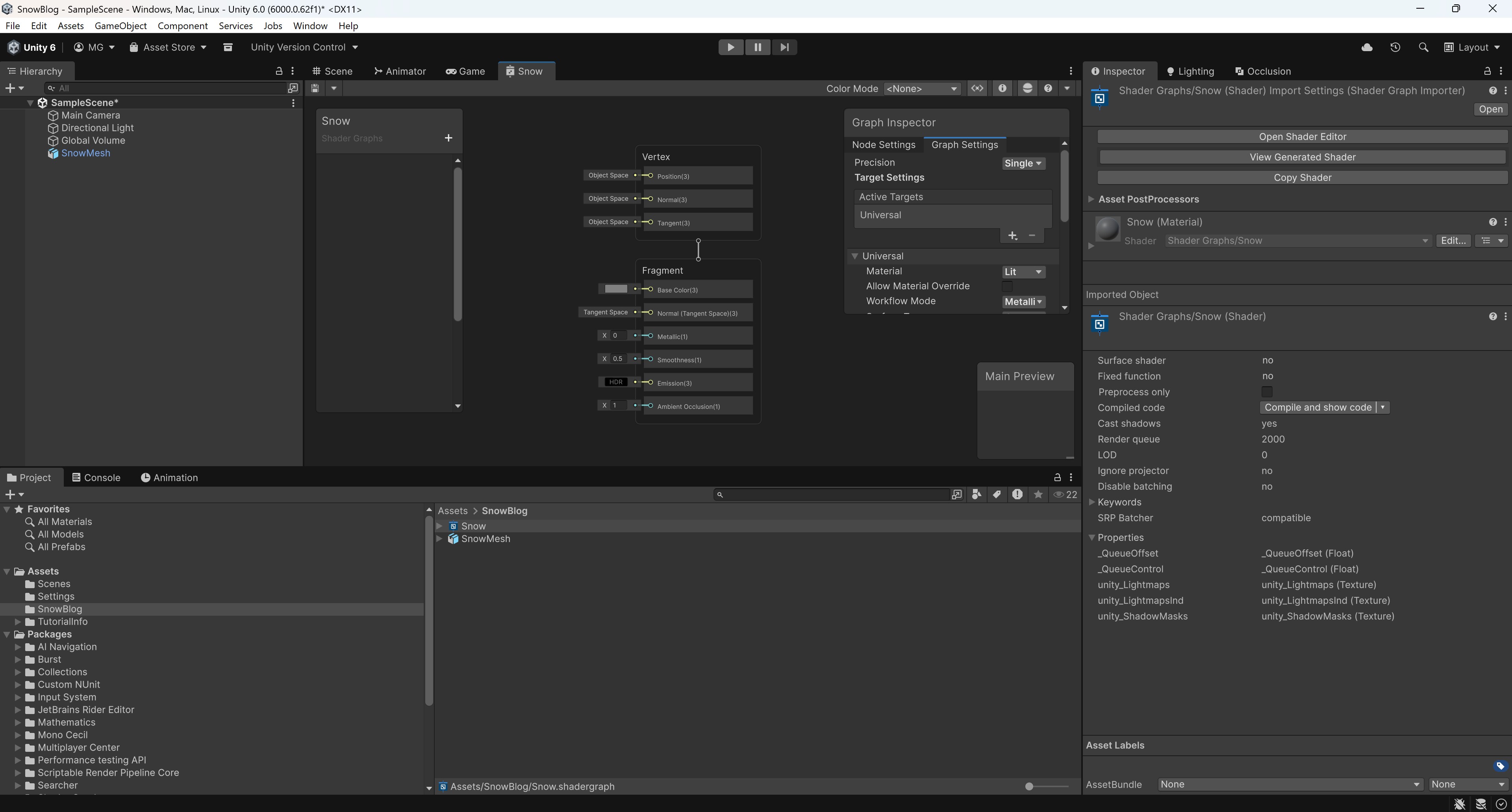 We used Shader Graph to build a shader for the snow. Right-click in your project, select Create -> Shader Graph -> URP -> Lit Shader Graph. This creates an empty shader with inputs for the vertex and fragment stage.