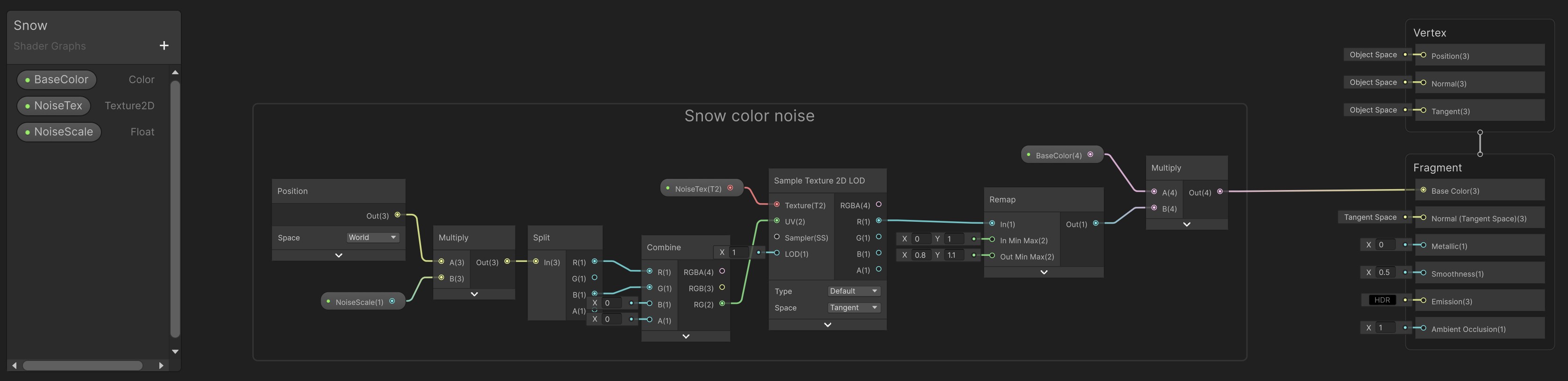 We tried adding another sparkle layer to mimic the bright individual crystals which perfectly reflect the light on a winter day. However, this would have required emission with either baked lighting or bloom post-processing. The former wasn't possible due to the dynamic nature of the snowfield, the latter wasn't desirable due to the extra performance required, so we decided not to add sparkle.