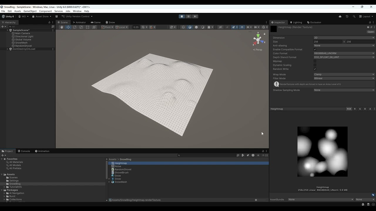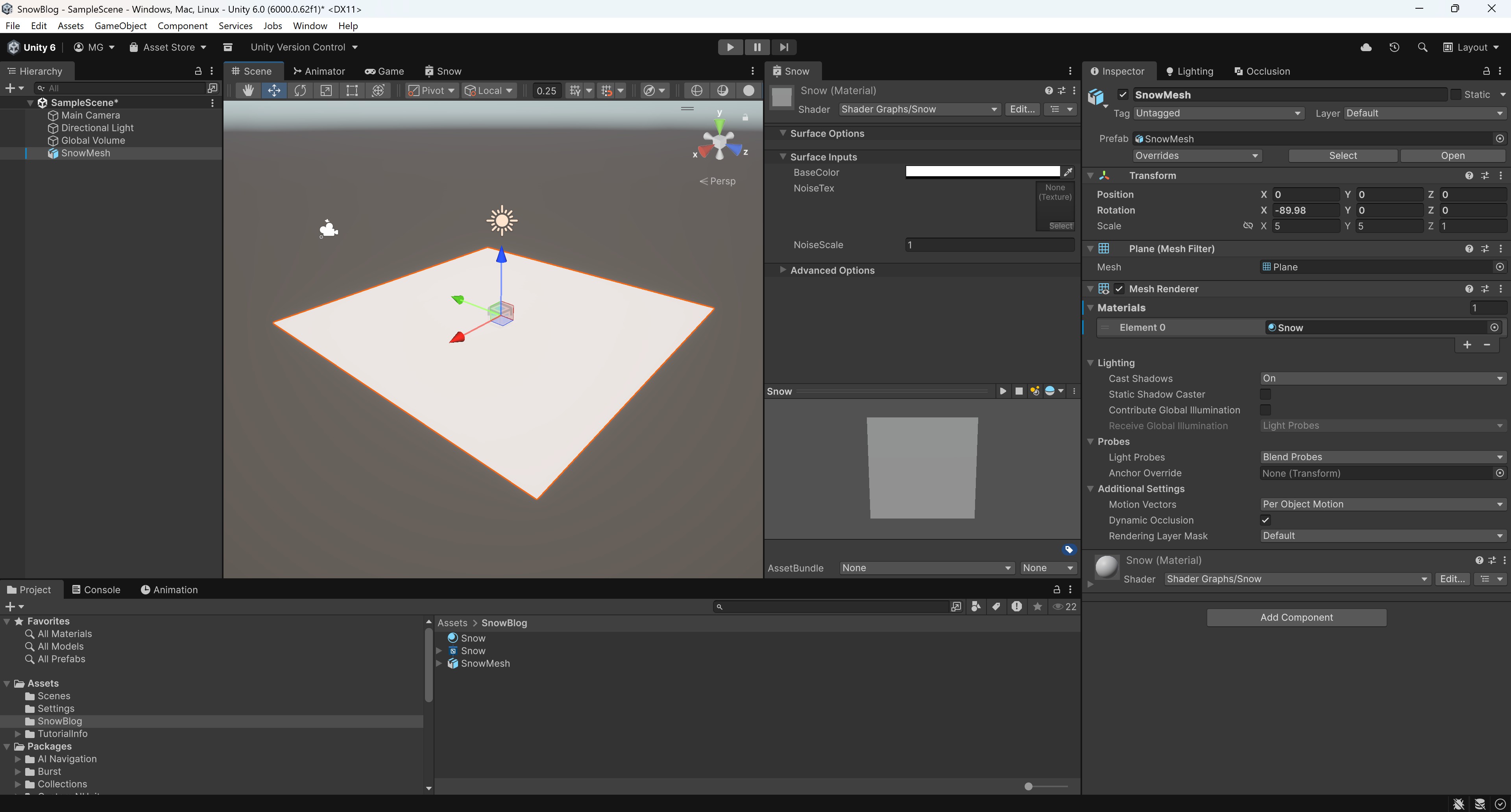 Now save this shader, right-click on it in the project view, and select Create -> Material. This will automatically create a material using this shader. Finally, drag the shader onto the snow mesh in the scene to assign the material.