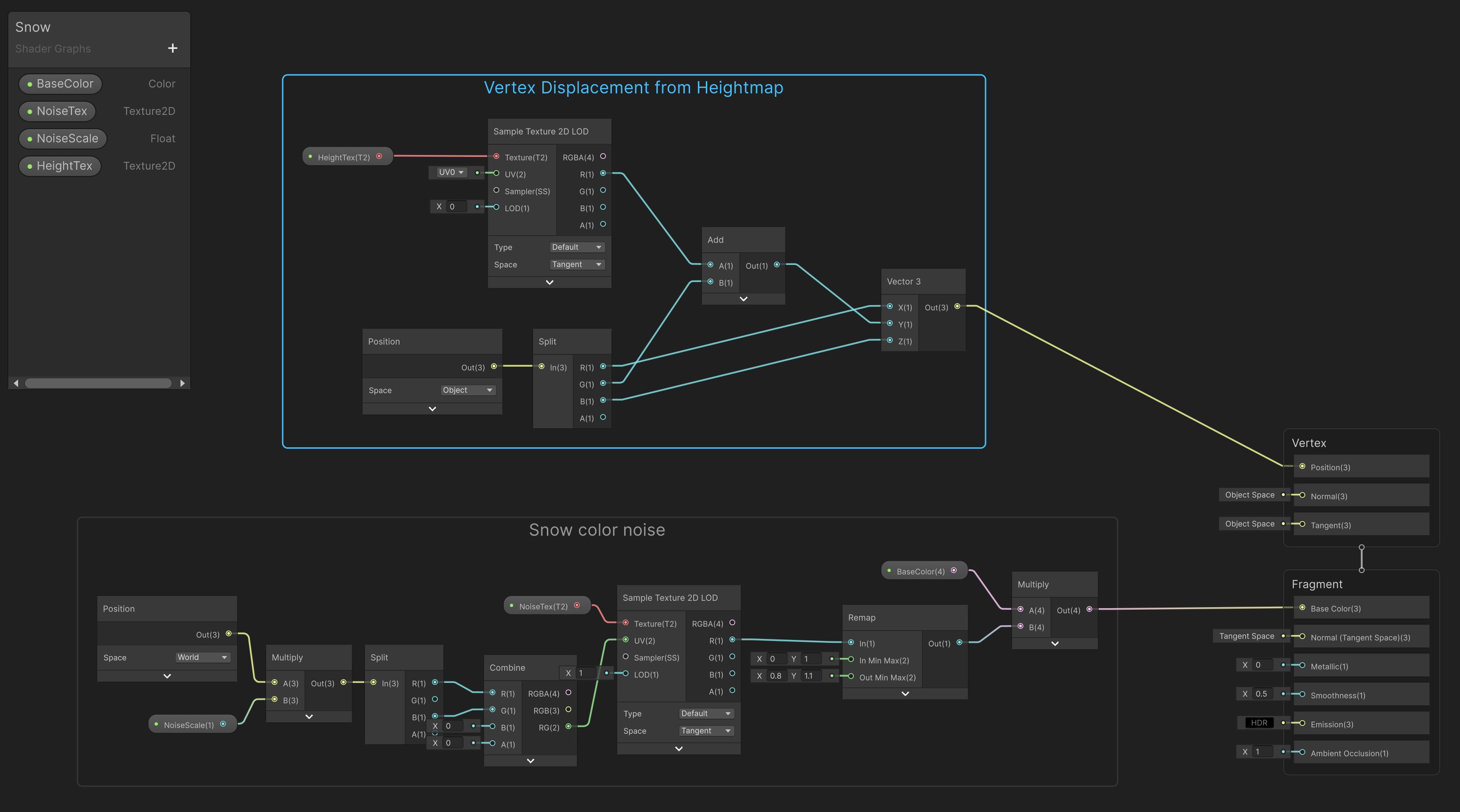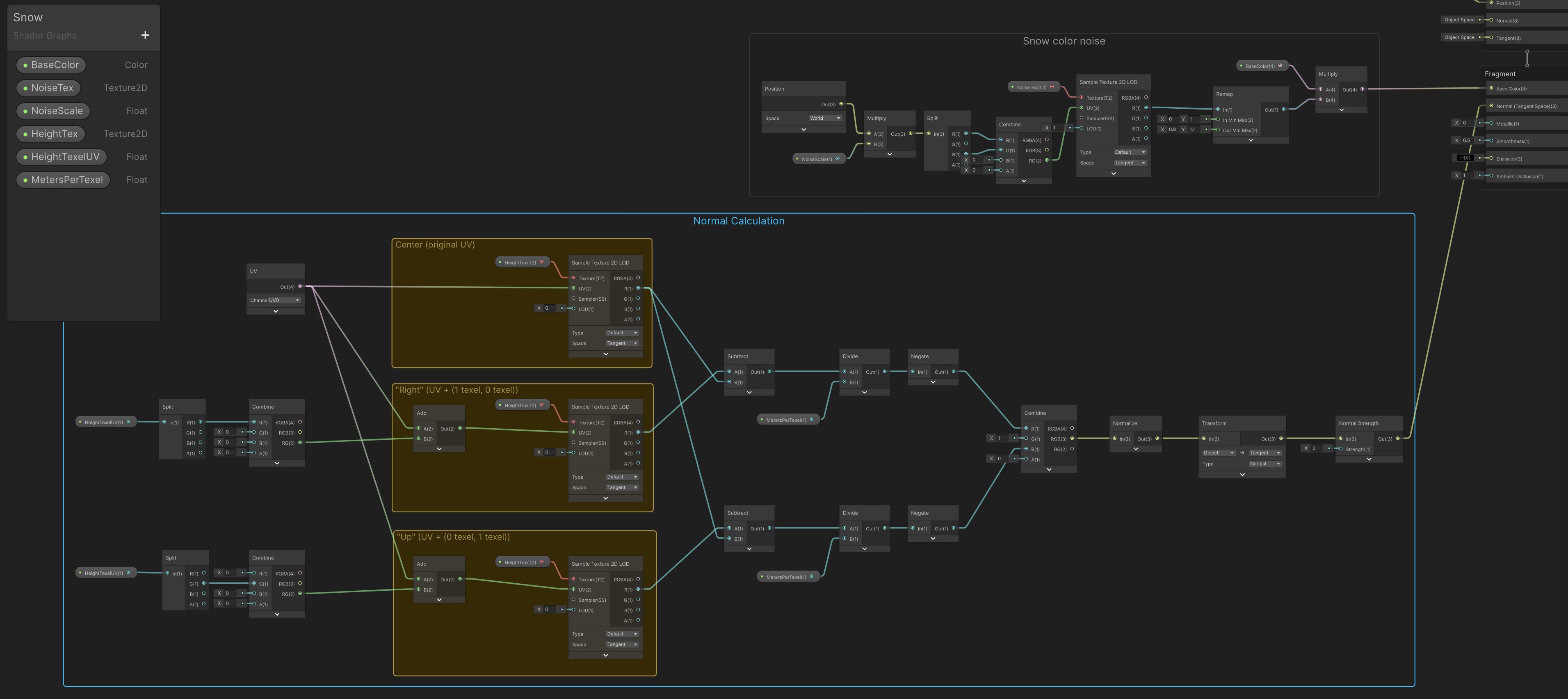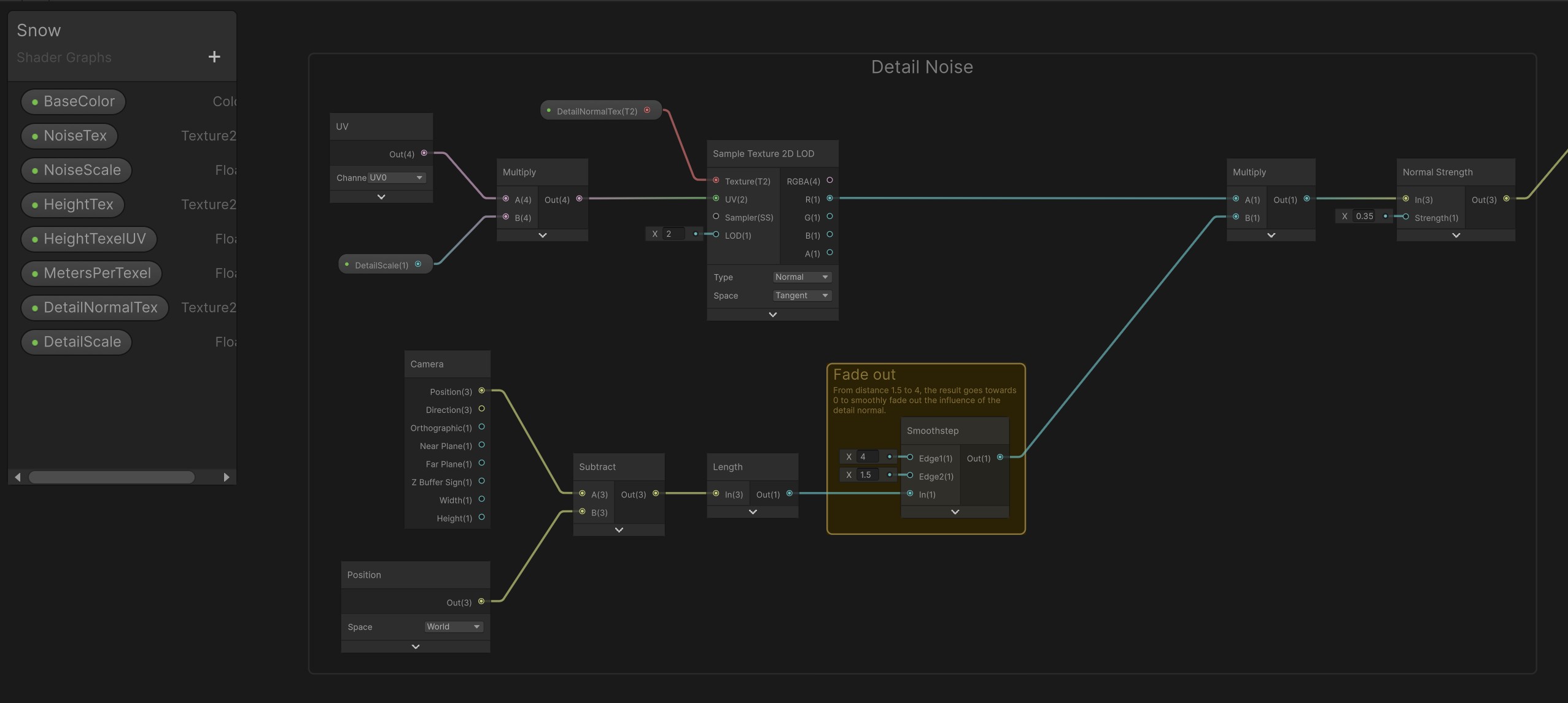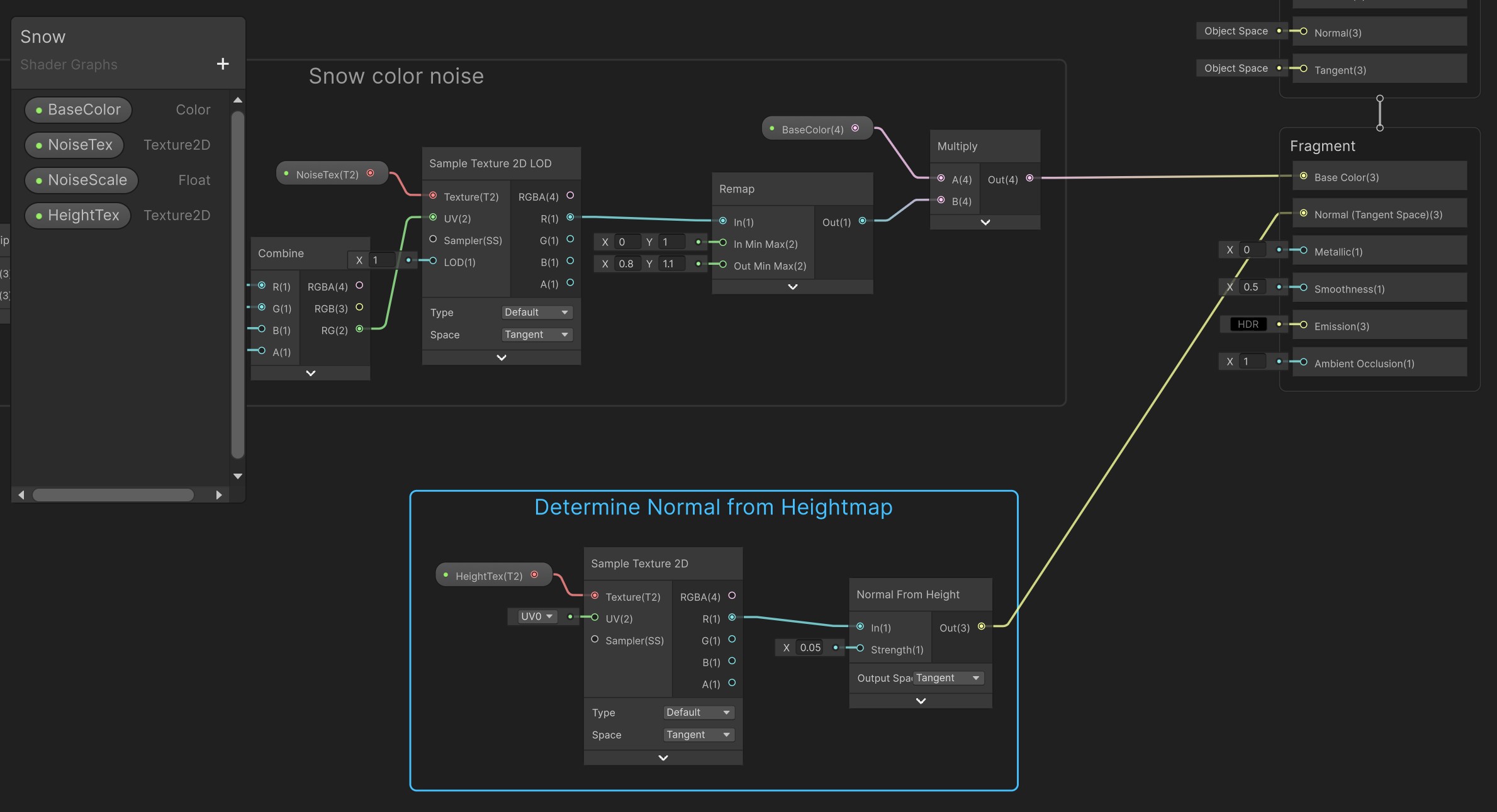 The output of this detail noise, and the output of the previous heightmap normal calculation, are now blended using the Normal Blend node. The output is fed into the Normal of the fragment stage.