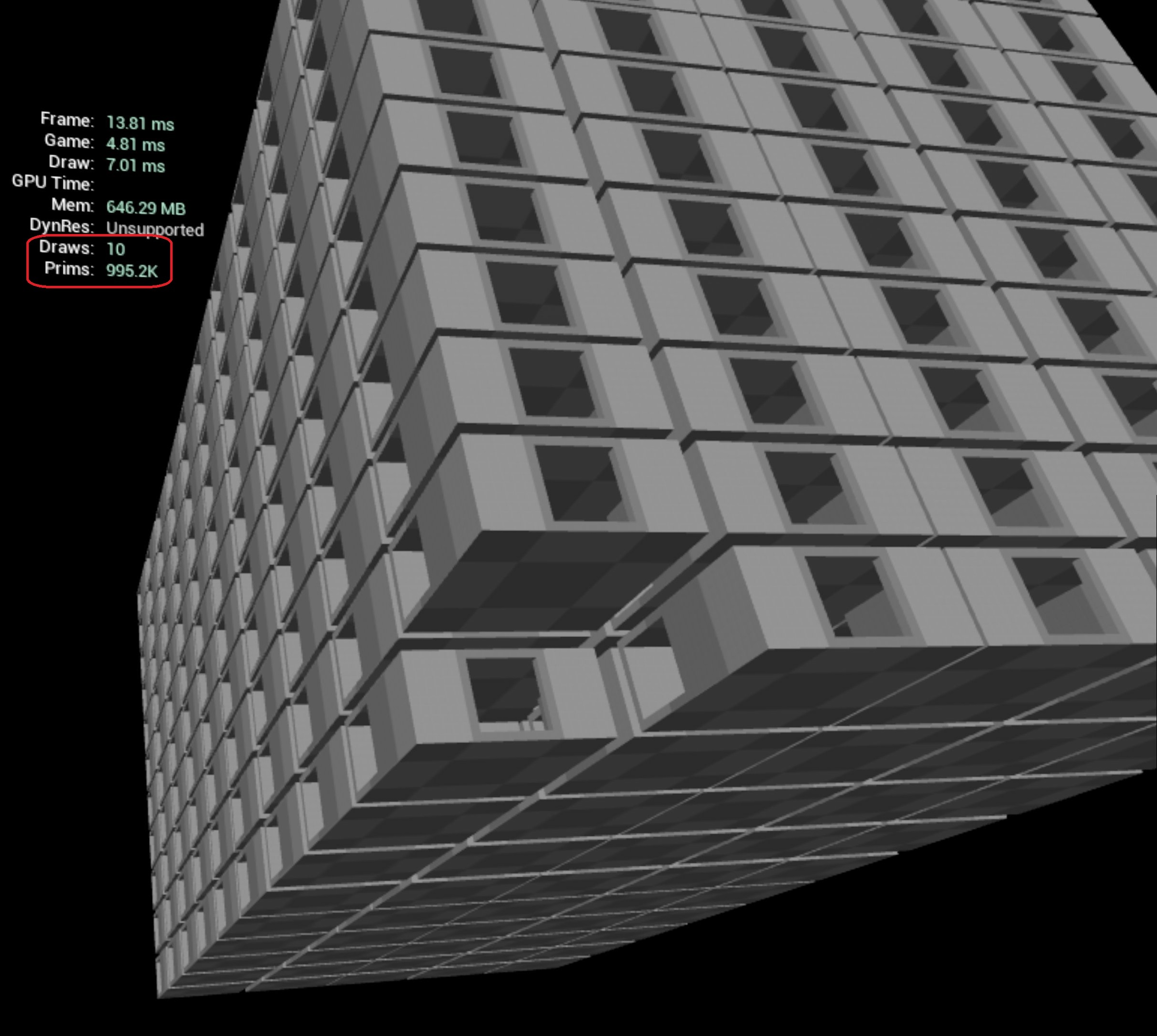 The result is pretty bad, given that every Packed Level Actor instance results in 1 draw-call. At least the proper LODs are used for each instance, reducing the number of rendered triangles significantly below the maximum of 990k.