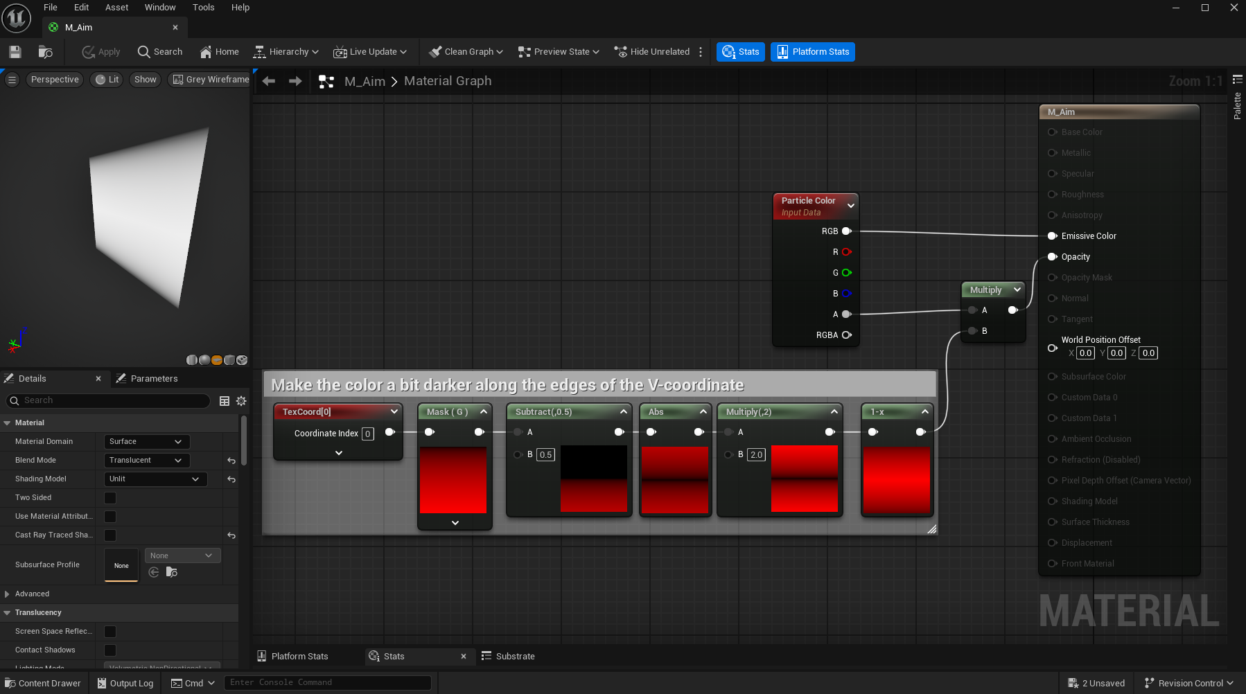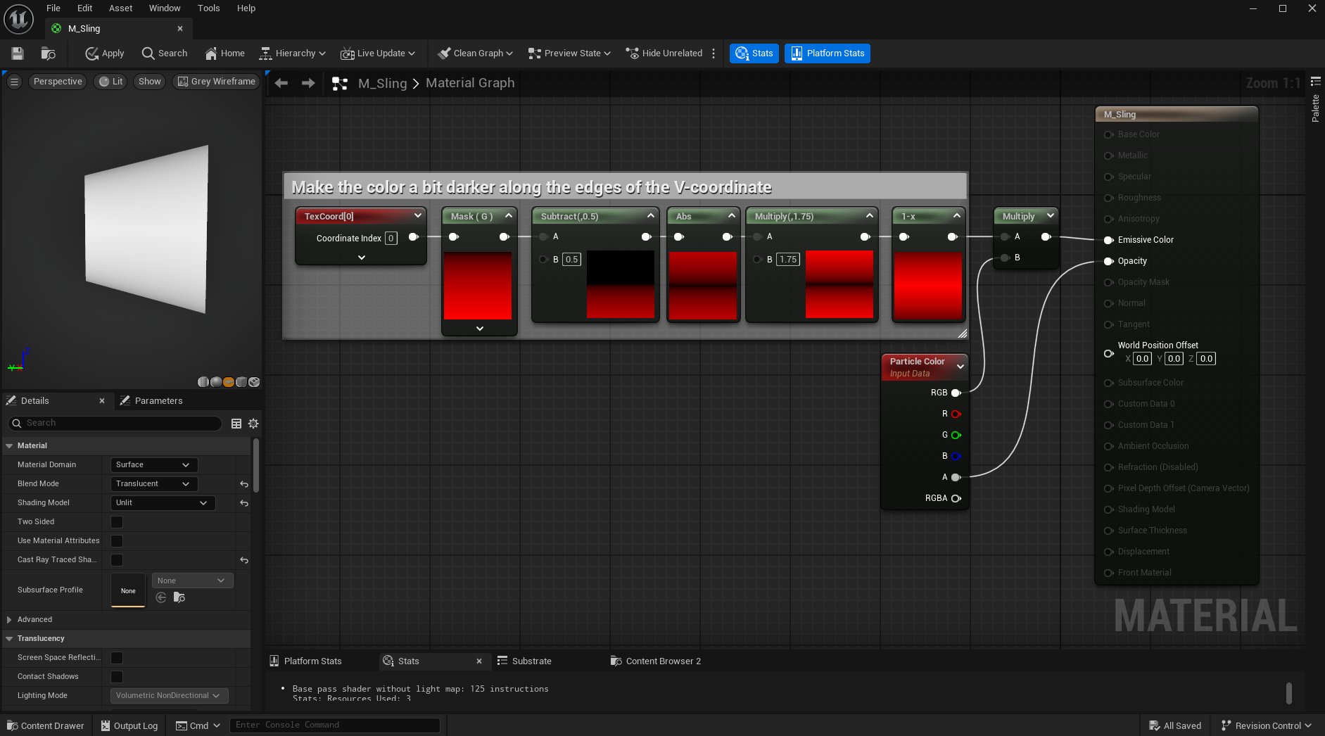 First we create a material for the sling as shown in the image below. Since we'll be using Niagara beams for the sling, and the default beam material is additive and has a gradient (meaning it is not fully opaque), we create our own beam material that can be fully opaque, and even adds a little bit of fade along the beam-edge to give the idea of a non-flat beam.