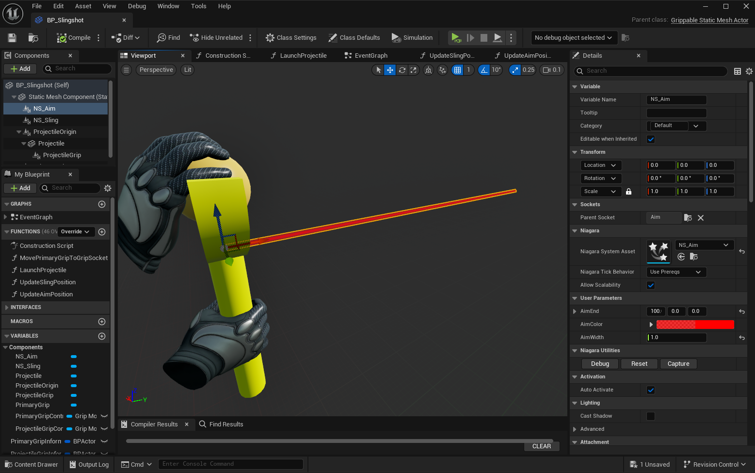 Now that the Niagara System is ready, we add it to the slingshot blueprint, attach it to the Aim socket, and provide some meaningful default values for the parameters: