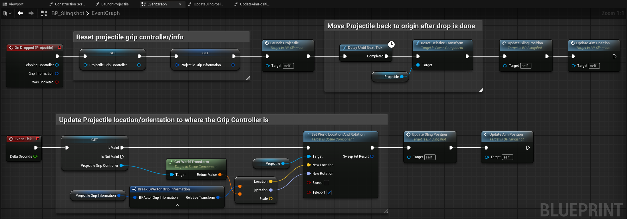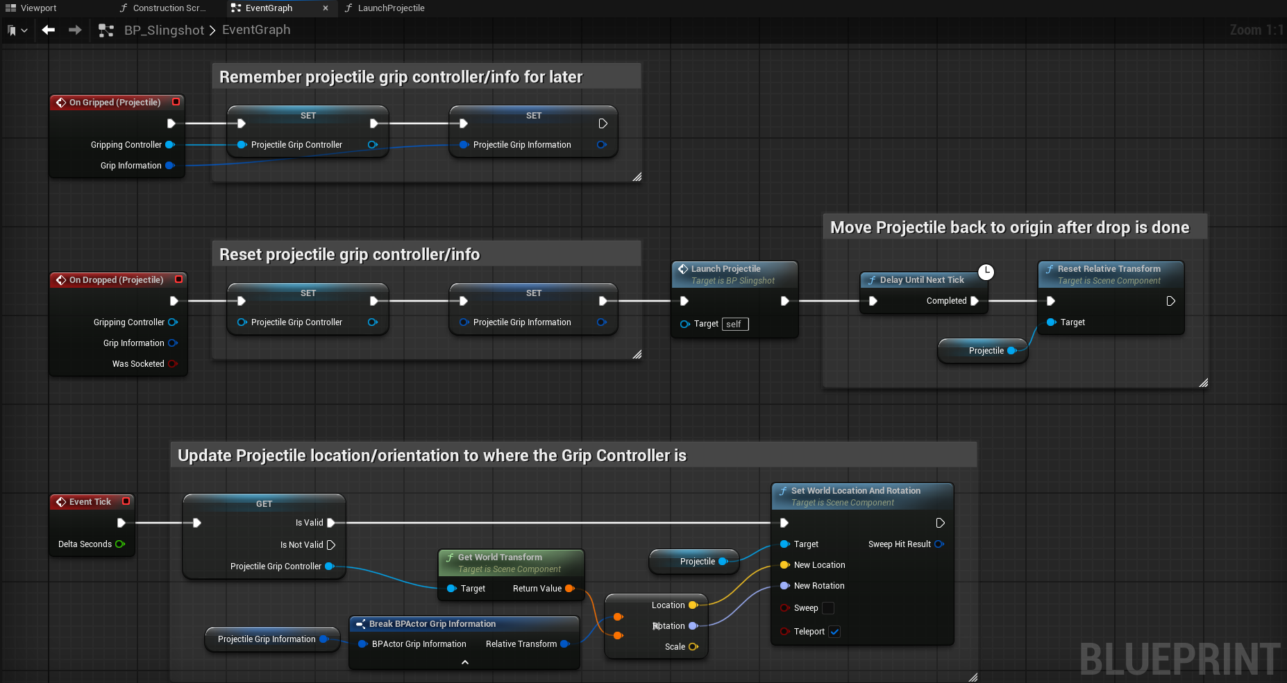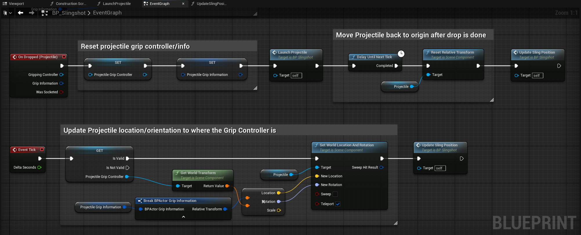 OnGripped- store the grip information, and start updating the projectile component location/orientation based on the hand location/orientation in the actorTickeventOnDropped- launch a projectile and return the projectile component back to its original location/orientationEvent Tick- if the projectile is being held, update its position/orientation to that of the hand that holds it