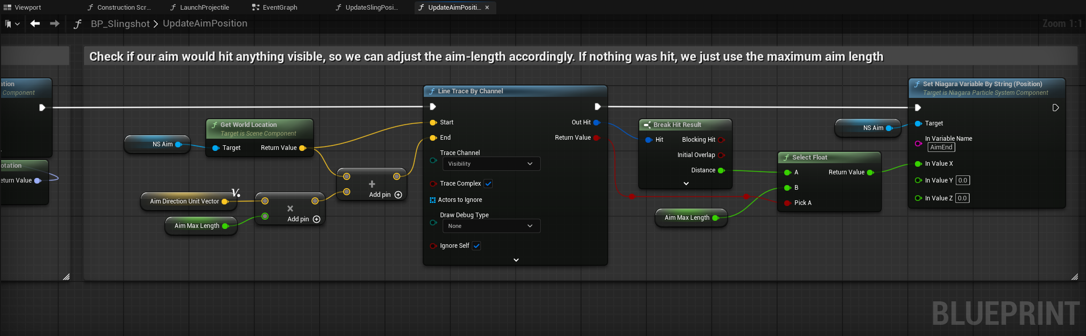 For this, we add a new function UpdateAimPosition to the Blueprint, and call it in 3 locations in the EventGraph:
