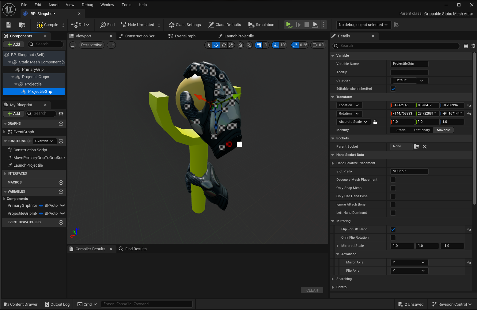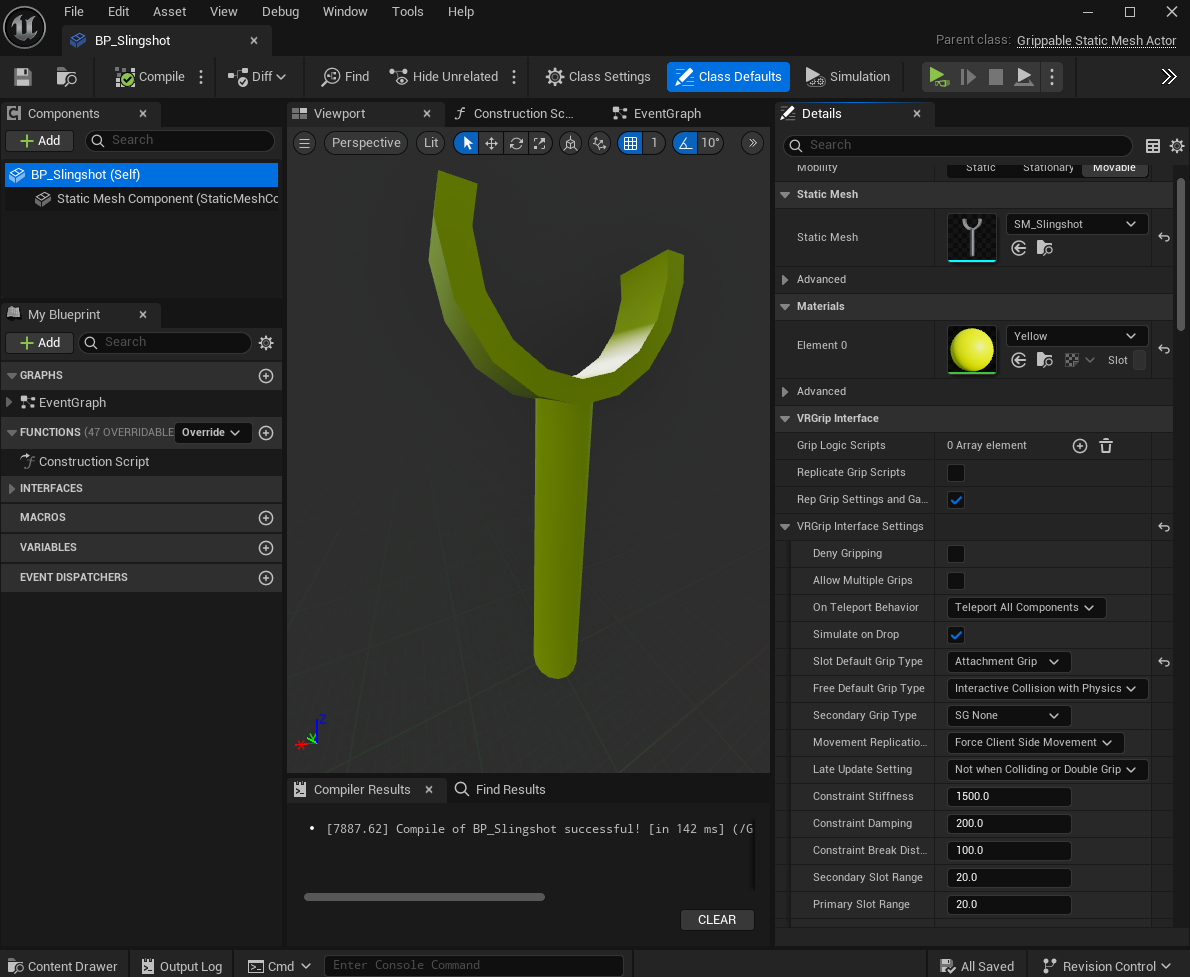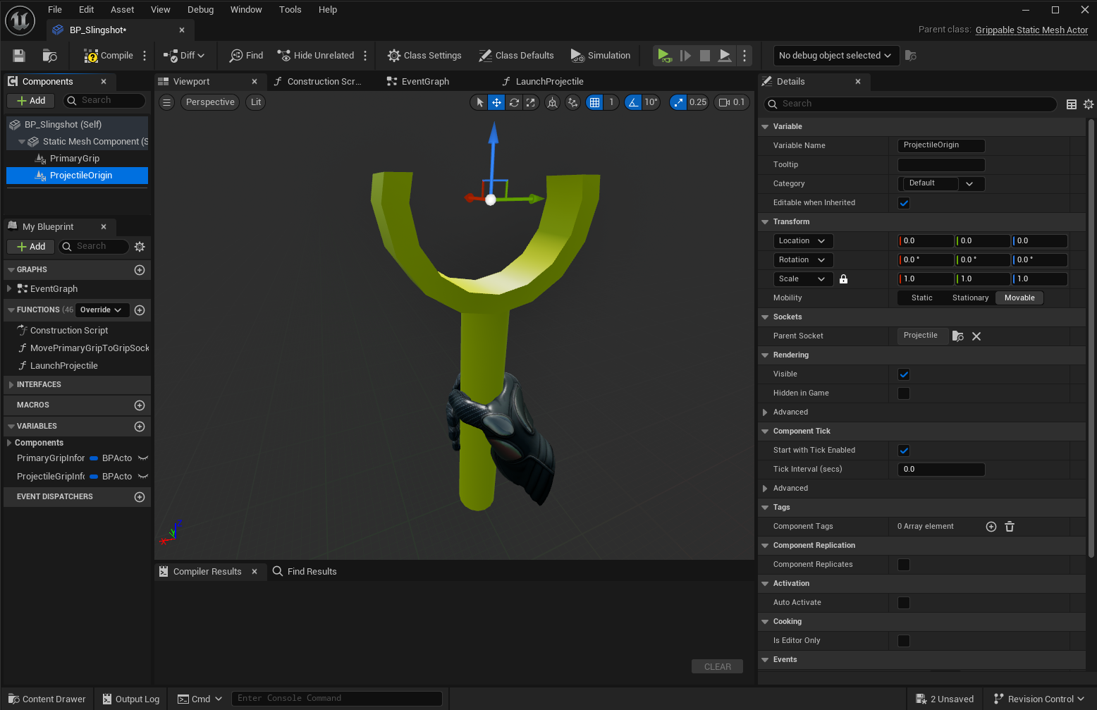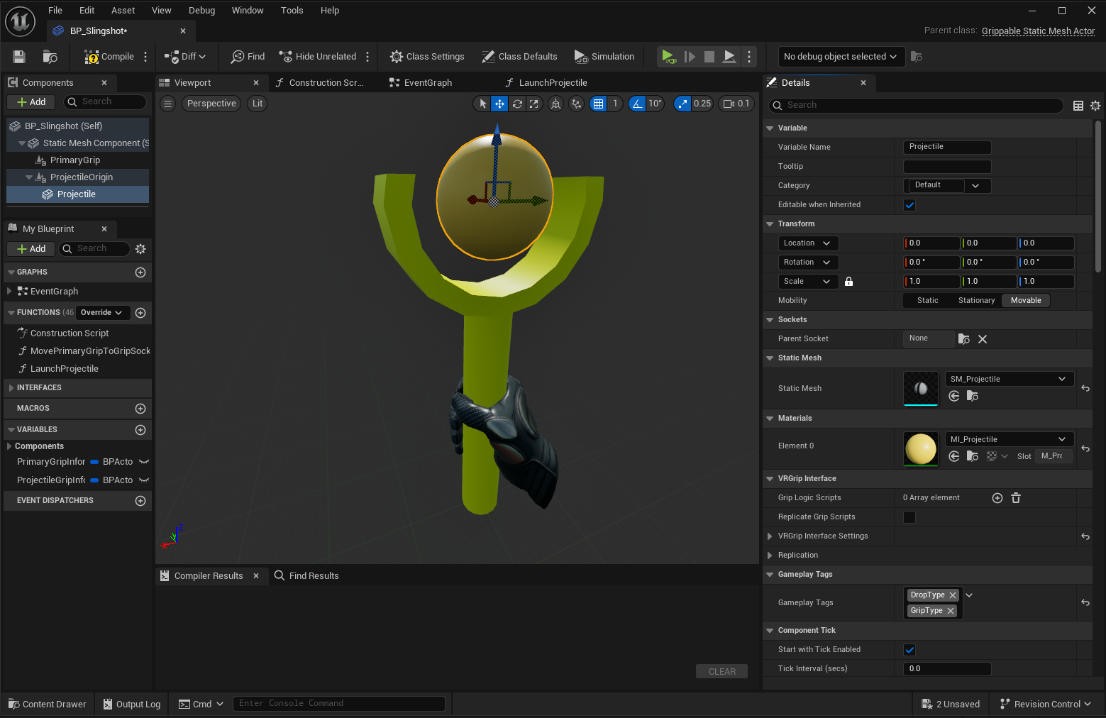 GrippableSphereComponentfor the projectile grip (instead of aGrippableStaticMeshComponent), so we can make it a little bigger than the projectile itself to make the projectile grip easier for the user (currently the user may accidentally grip the slingshot itself when the hand is too much too the left or right from the projectile) - Separate the projectile from the slingshot (so that the user must pickup a projectile from somewhere else, and can then use it with the slingshot)