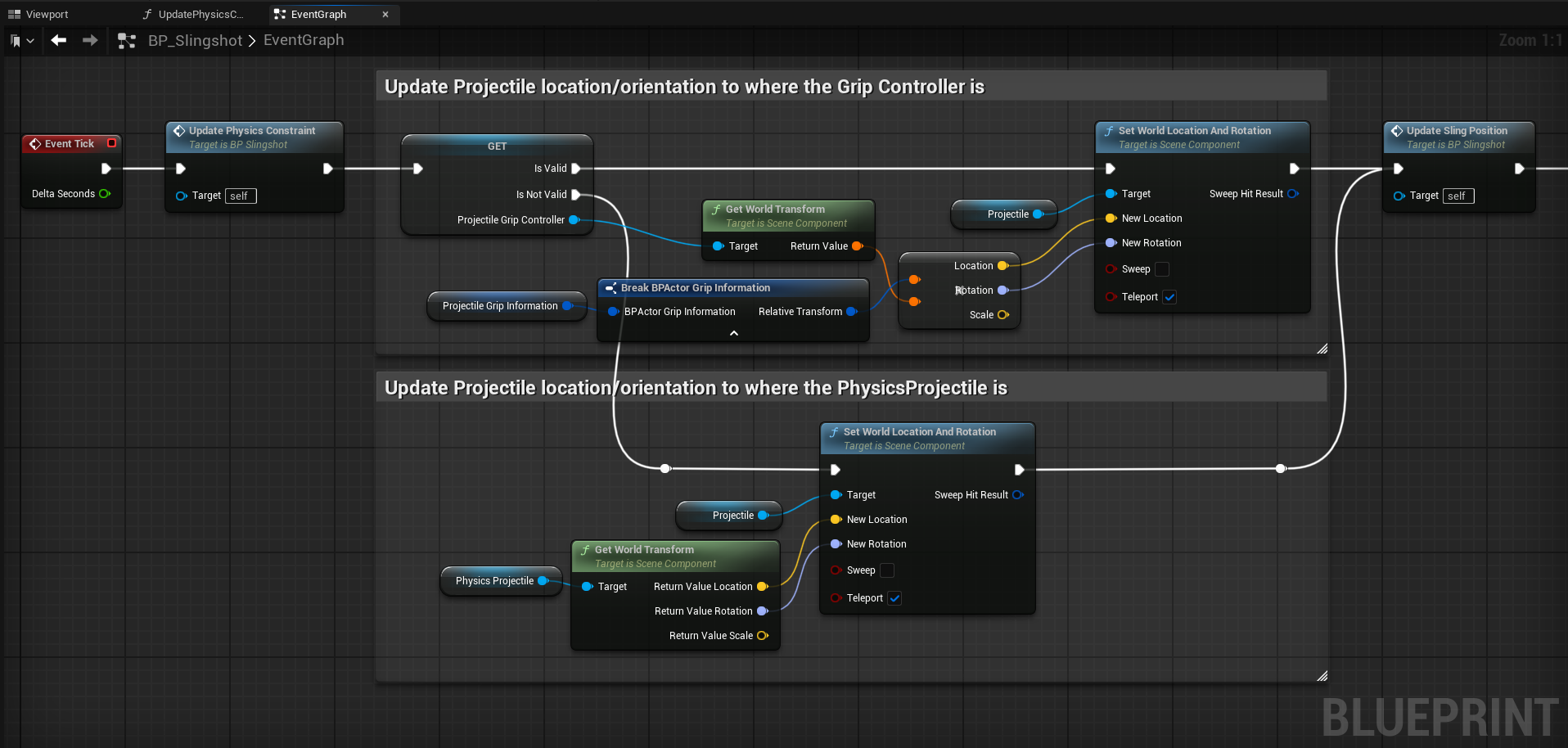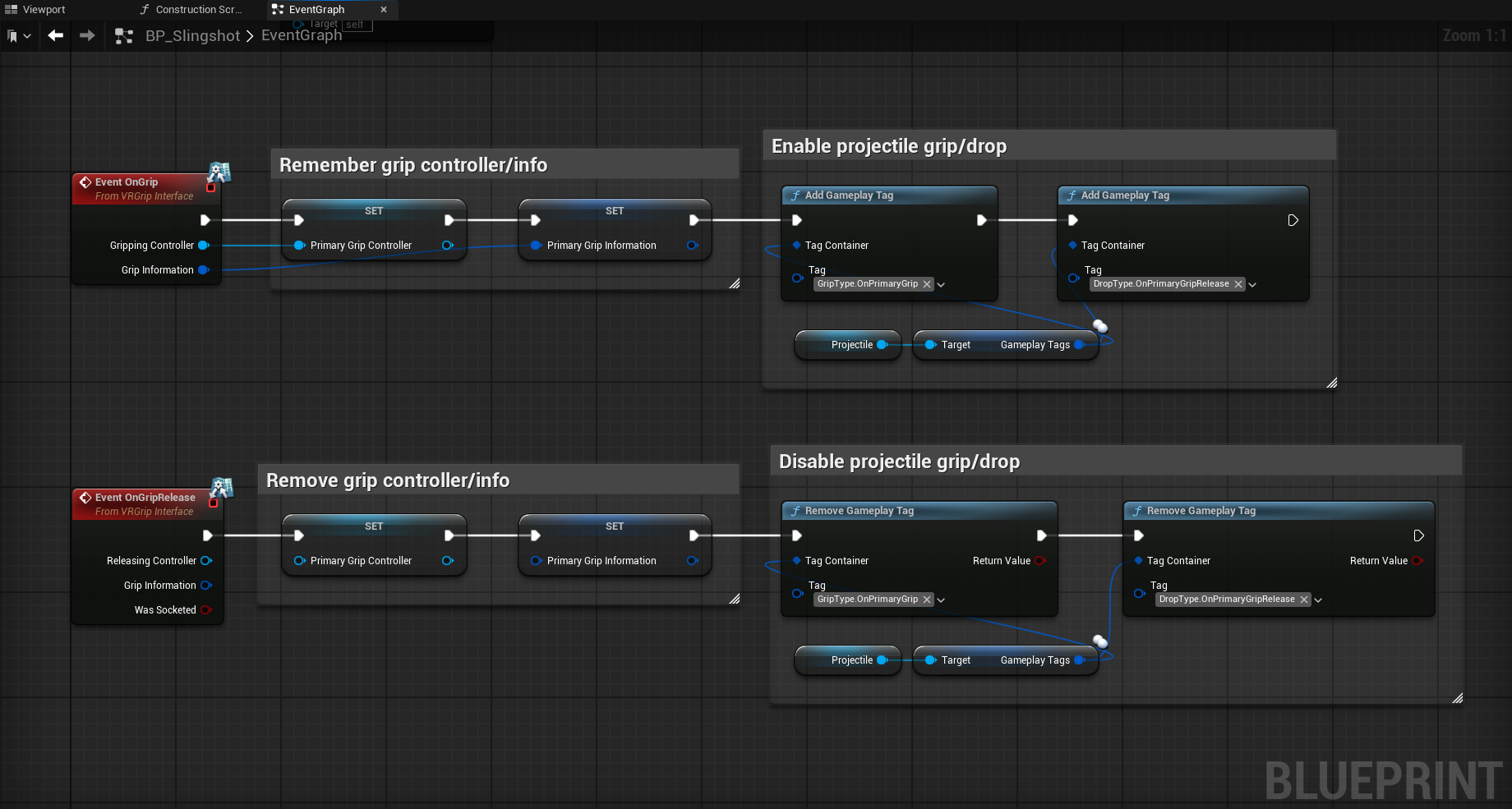Thus, we add some logic when the slingshot is grabbed/released to enable/disable the projectile grab, by implementing the corresponding VR Grip Interface methods on the actor: