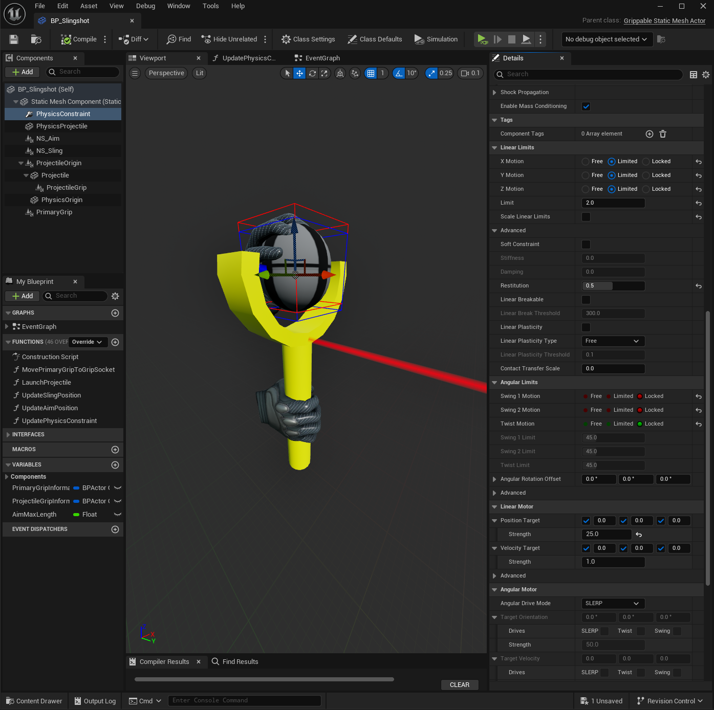 PhysicsConstraintcomponent that links both components and keeps the PhysicsProjectile in the correct place, even if we move or rotate the slingshot