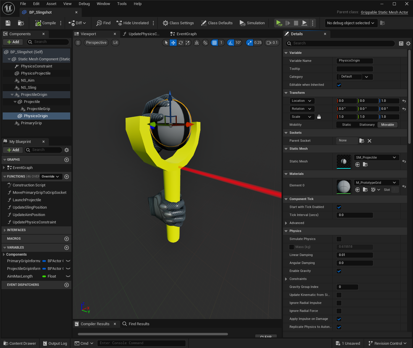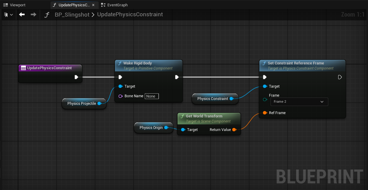 In order to make this work properly when moving the slingshot, we need to wake the PhysicsProjectile and adjust the Reference Frame every tick. We do this by adding a new function UpdatePhysicsConstraint, and calling this at the start of the Event Tick in the EventGraph.
