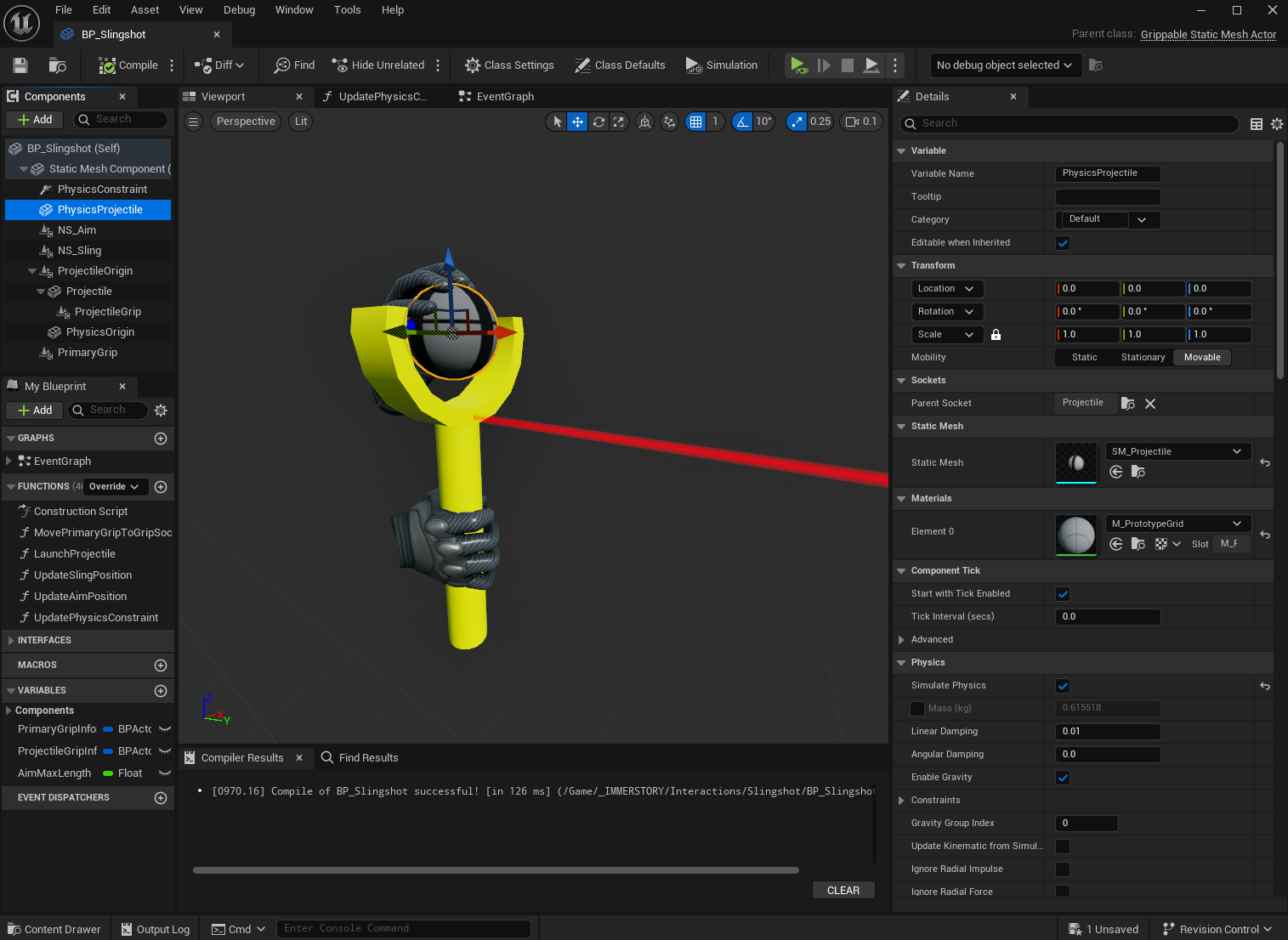 To help the user aim the slingshot, we add another Niagara system for a laser that points in the direction where the projectile will be fired at. It also indicates when the projectile will be launched when dropped, as we only enable the laser when the projectile is more than 15cm from its original origin.