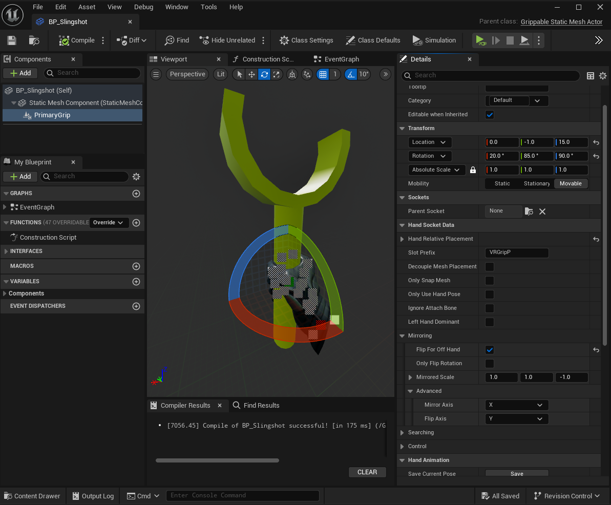 Note: Normally we would attach the PrimaryGrip component to the Grip socket of the slingshot mesh, however this component does not work well with sockets. So instead, in the Begin Play event, we set its location/orientation to that of the socket.