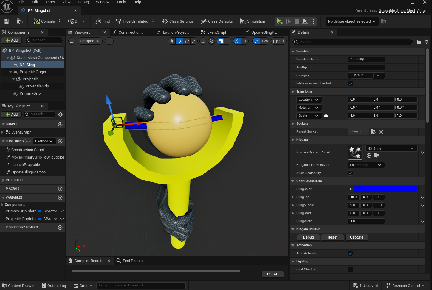 - Sling Niagara system - displays the dynamic sling between the Slingshot mesh and the projectile before the projectile is launched