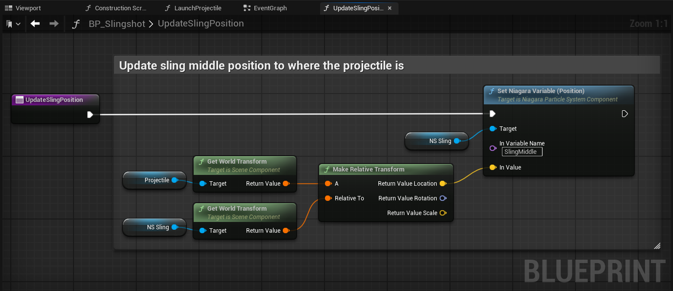 Now we need to ensure that the middle of the sling always corresponds with the location of the projectile, so we add a new function UpdateSlingPosition to the blueprint, and call it in 2 locations in the EventGraph: