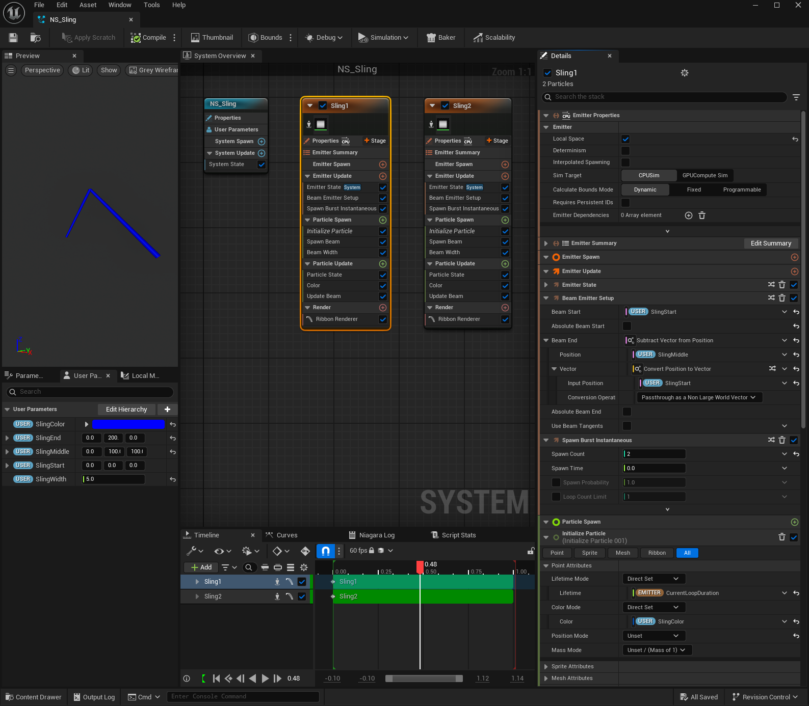 Then we create a Niagara System with 2 emitters, one for each side of the sling.