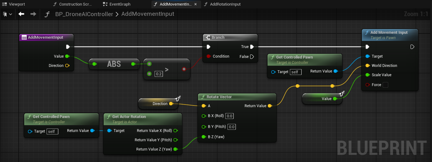 This may seem counterintuitive, however each player can only have a single PlayerController, which is already controlling the player's pawn. So in order to control the drone pawn, we instead subclass AIController, and implement the player input mapping there, which ensures a good separation of concerns. As an additional benefit, this way we can even selectively process the player input based on gameplay events or player input, switch to a different drone or even a different controller altogether with different behaviors.