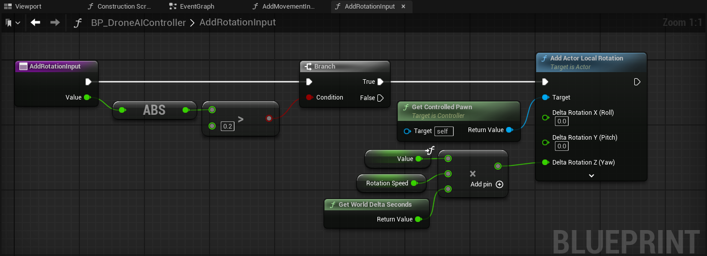 We implement a single blueprint function to apply rotation with a given magnitude (with a value between -1.0 and 1.0), which has the following main steps: