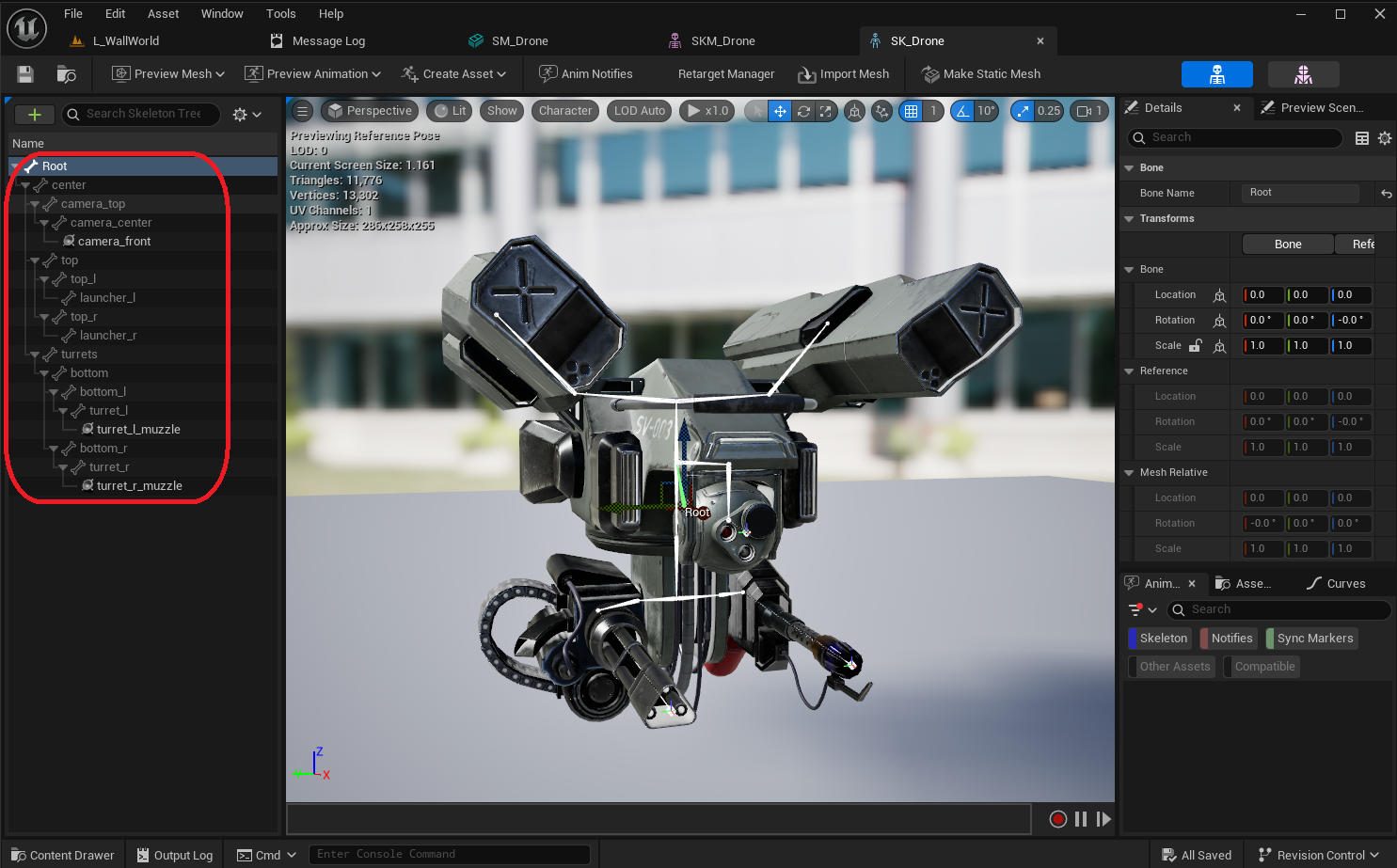 center- a bone that we'll use to lean the whole drone in the direction of movementturrets- a bone that rotates the whole lower section with the gun and the flamethrower from left to rightbottom_l- a bone that rotates the flamethrower up and downbottom_r- a bone that rotates the gun up and downturret_l_muzzle- a socket where the flames for the flamethrower can be generatedturret_r_muzzle- a socket where the bullets for the gun can be generatedcamera_top- a bone that rotates the camera-sphere from left to rightcamera_center- a bone that rotates the camera-sphere up and downcamera_front- a socket we can use for starting vision queries