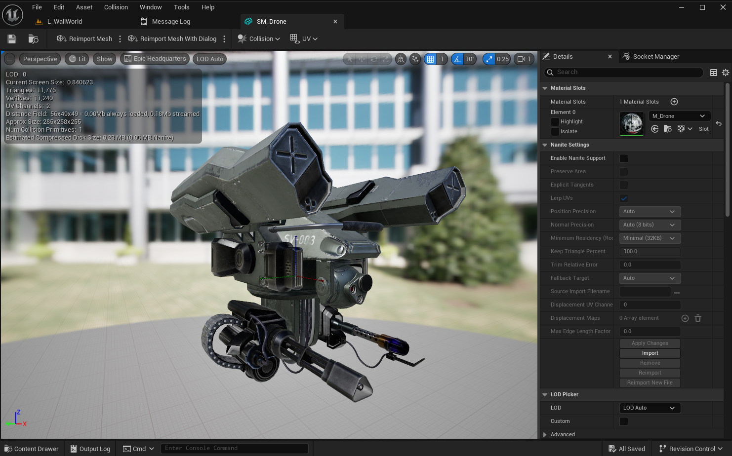 We found a cool drone on the Fab store, which came as a skeletal mesh with several animations. For the sake of this devlog, we've converted it to a static mesh and imported that into our project. This way, we can demonstrate the full process of creating the skeleton, skinning the mesh and creating the animation blueprint for procedural animations.