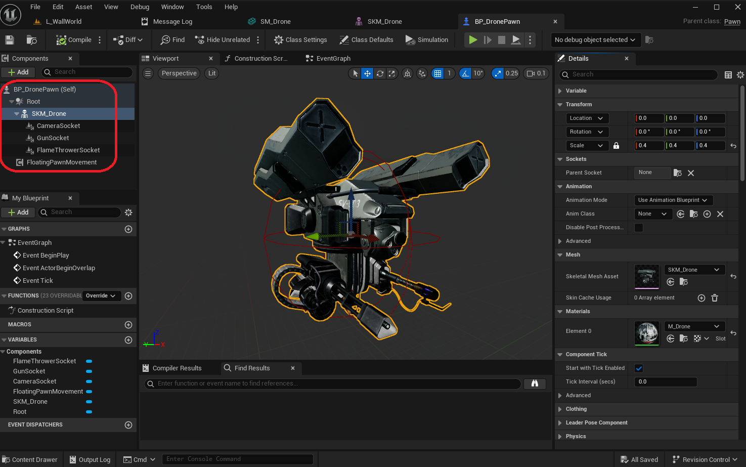 Root- aSphere Collisionwith a radius of 50SKM_Drone- aSkeletal Mesh Componentwith theSkeletal Mesh Assetset to theSKM_Droneand a scale of 0.4 so it nicely fits the sphere collisionCameraSocket- aScene Componentattached to thecamera_frontsocket of the skeleton, so we can easily access its transform in the blueprint logicGunSocket- aScene Componentattached to theturret_r_muzzlesocket of the skeleton, so we can easily access its transform in the blueprint logicFlameThrowerSocket- aScene Componentattached to theturret_l_muzzlesocket of the skeleton, so we can easily access its transform in the blueprint logic