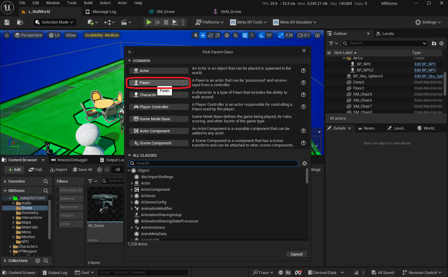 In order to place the drone into a level, and later control it with the motion controllers, we need to create a Pawn blueprint.