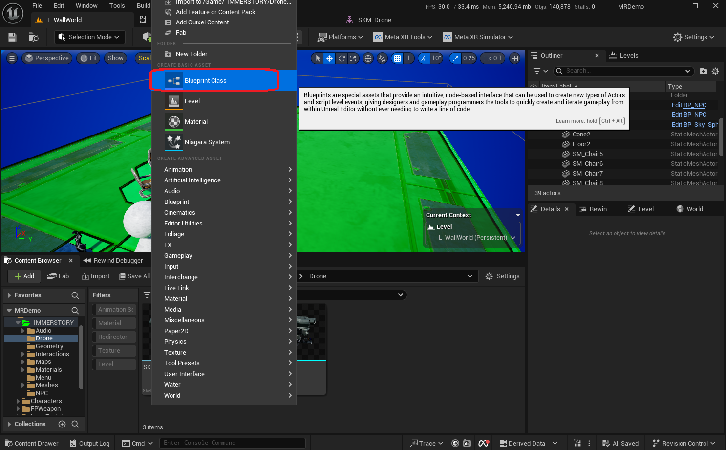 Now that we have a drone pawn and controller, we can add it to the sublevel and test it.