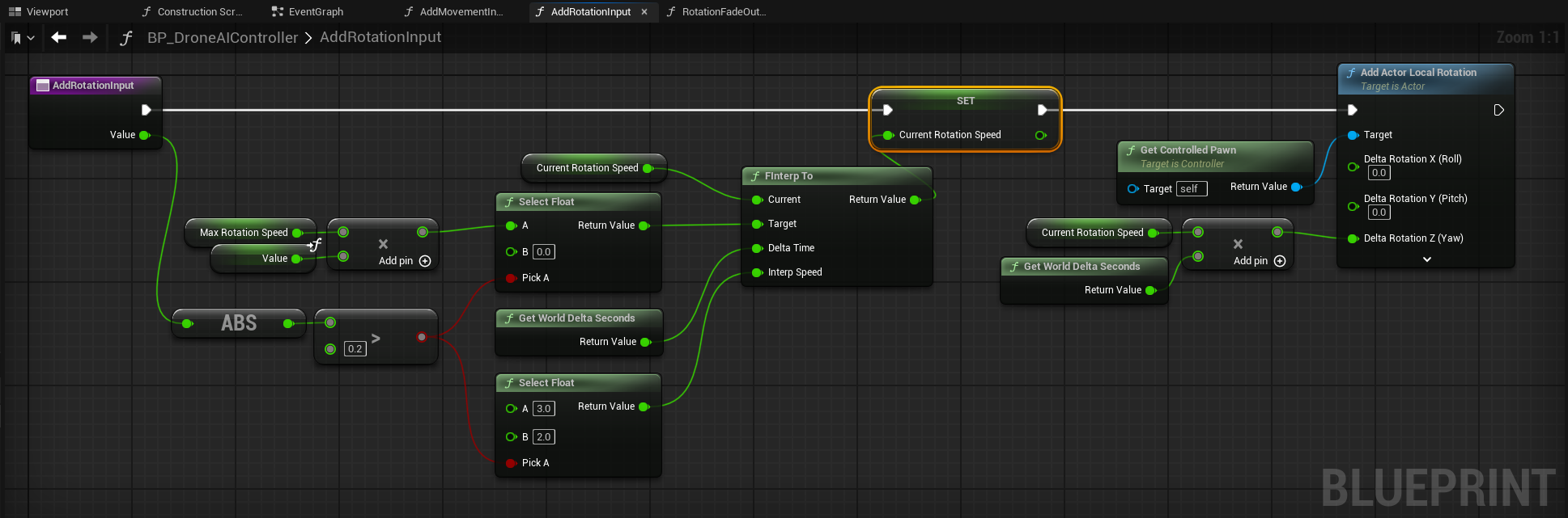 CurrentRotationSpeedis not close to 0, we rotate the pawn by the value ofCurrentRotationSpeedconsidering the frame duration - This ensures that when finishing the rotation, the actual rotation is faded out over some time instead of stopping instantly