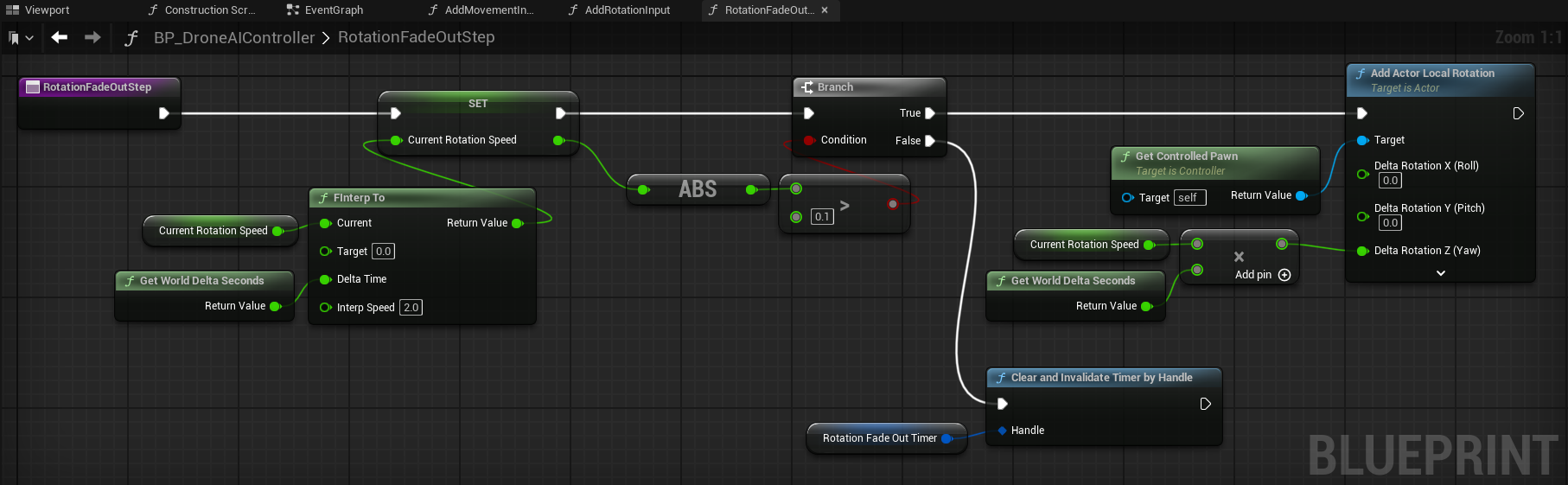 CurrentRotationSpeedto approach0in about 0.5 seconds usingFInterpTo - We rotate the pawn by the value of