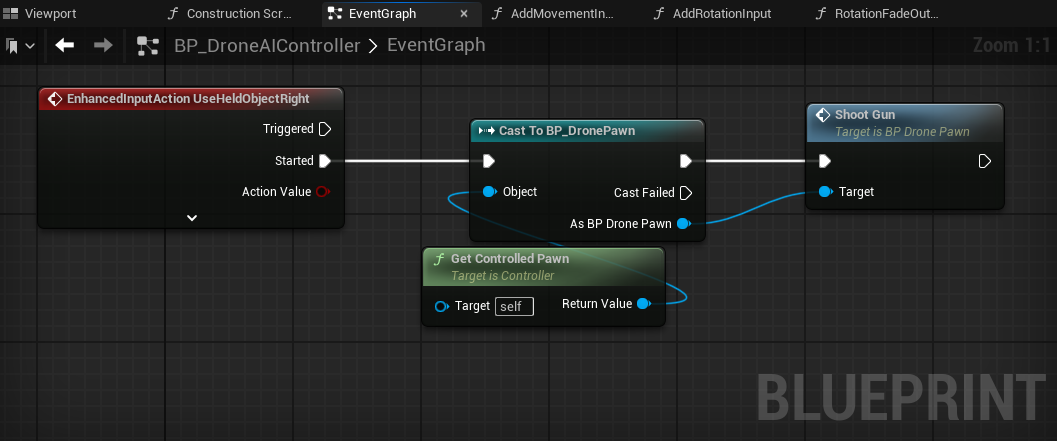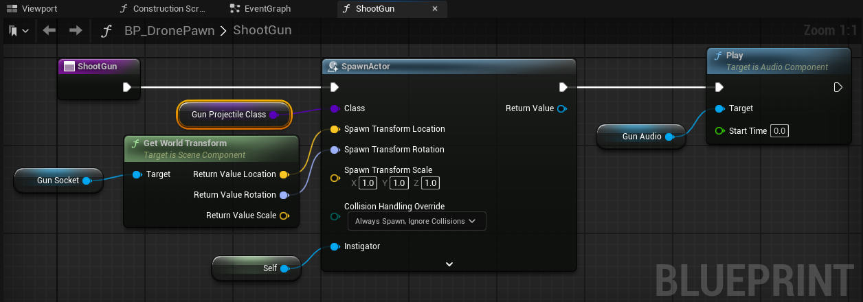ShootGunfunction in the drone pawn, where a projectile is spawned at the GunSocket, and the GunAudio is played